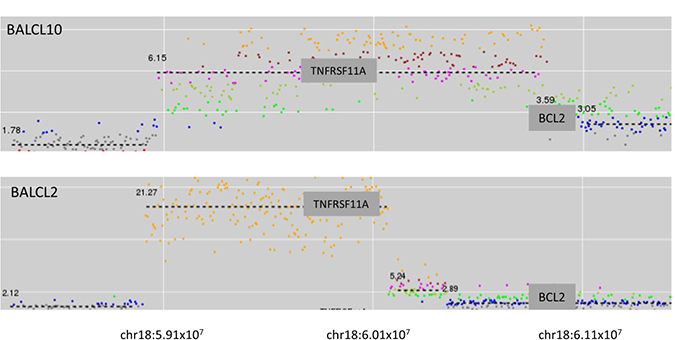 Figure 2: Two cases of breast implant-associated anaplastic large cell lymphoma with high level amplification of TNFRSF11A (RANK).