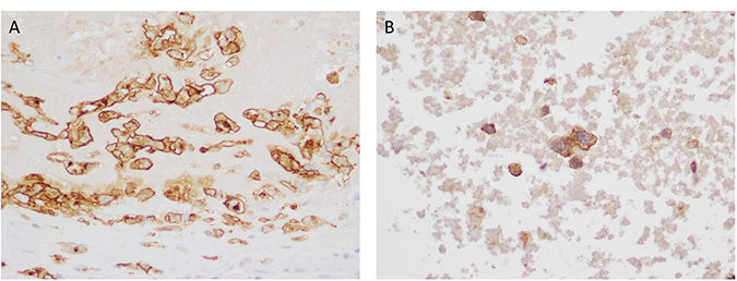 Figure 3: (A) RANK immunohistochemistry in a case of breast implant-associated anaplastic large cell lymphoma (BIA-ALCL) with TNFRSF11A (RANK) amplification (×400) (B) PDGFRA immunohistochemistry in a case of BIA-ALCL with PDGFRA amplification.