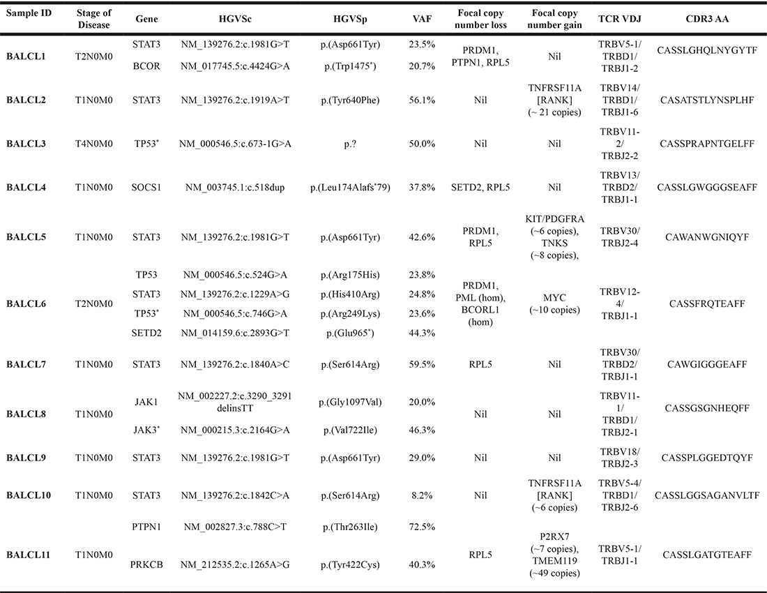 Table 1: Sequence variant, copy number changes and TRB characteristics from eleven cases of breast implant associated anaplastic large cell lymphoma (BIA-ALCL)