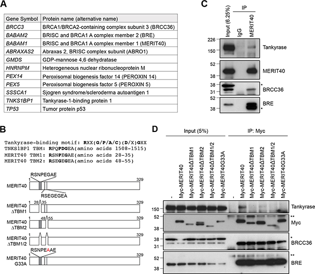 To identify novel tankyrase-binding proteins, we immunoprecipitated transiently expressed FLAG-tagged tankyrase in HEK293T cells and performed LC-MS analysis of the immunocomplexes. The results identified 11 tankyrase-interacting proteins, including TNKS1BP1, a well-established tankyrase-binding protein (Figure 1A) [27]. The potential 11 tankyrase-binding partners included BRCC3/BRCC36, BRE/BABAM2 and MERIT40/BABAM1, which are components of the BRCA1-A complex. Furthermore, ABRO1/ABRAXAS2, which forms another complex with BRCC36-BRE-MERIT40 in the cytoplasm called the BRISC1 complex [28–30], was also in the identified protein list. MERIT40 is a 329 amino acid protein that possesses two tankyrase-binding motifs (TBM): RSNPEGAE at amino acids 28–35 (TBM1) and RSEGEGEA at amino acids 48–55 (TBM2) (Figure 1B) [31, 32]. We examined the interaction between MERIT40 and tankyrase in A549 cells and confirmed that endogenous tankyrase was co-immunoprecipitated with MERIT40 (Figure 1C). BRCC36 and BRE were also detected by the immunoprecipitation with anti-MERIT40 antibody (Figure 1C), suggesting that tankyrase was another member of the BRE-BRCC36-MERIT40 complex.