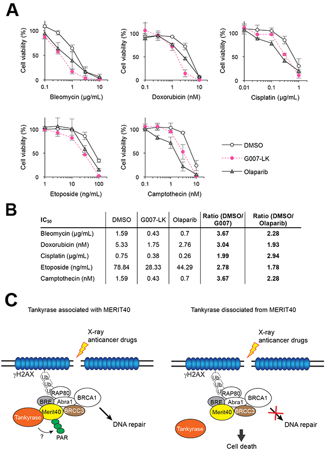 Figure 4: Tankyrase inhibitor enhances the growth inhibitory effects of DNA-damaging anticancer drugs. (A) A549 cells were treated with DNA-damaging anticancer drugs (bleomycin, doxorubicin, cisplatin, etoposide and camptothecin) at various concentrations in the presence or absence of 3 μM G007-LK or olaparib. After a 10-day cultivation, colonies were quantitated and normalized with the colony numbers from cells treated with either DMSO, G007-LK or olaparib alone, in which cell viability was defined as 100%. Three independent experiments were performed and each experiment was performed in triplicate. (B) The IC50 values of each drug treatment in A is shown in the table. The ratios of IC50 values in the combination treatment of DNA-damaging anticancer drugs with G007-LK or olaparib compared with the anticancer drugs with DMSO are shown in the right column. (C) A schematic model of potentiated sensitivity to DNA damage by tankyrase inhibition. Left: when DNA double-strand break (DSB) is created by X-ray or anticancer drugs, tankyrase forms a complex with MERIT40-BRE-BRCC36 through direct association with MERIT40. Then, tankyrase-mediated PARsylation plays a role to facilitate the DNA repair process. Right: inhibition of either tankyrase-MERIT40 association or tankyrase PARP activity causes dysfunction in DNA repair process, resulting in deleterious effects, such as cell death.