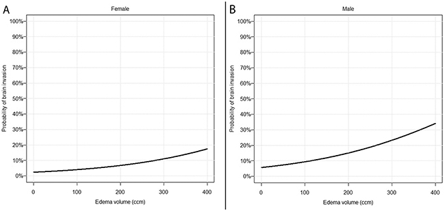 Figure 2: Prediction of brain invasion using findings on preoperative MRI. Predicted probability of brain invasive growth depending on PTBE volume in females (A) and males (B) according to the final multivariable model (Table 2).