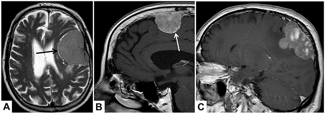 Figure 3: Illustrative examples of the analyzed MRI variables. In (A), axial T2-weighted MRI shows cerebrospinal fluid at the brain/meningioma border (arrow), indicating a distinct tumour surface with an intact arachnoid layer. In (B and C), sagittal T1-weighted images show a contrast-enhancing tumour capsule (B, arrow), a heterogeneous gadolinium enhancement (C) and an irregular tumour shape with mushroom-like growth (C).