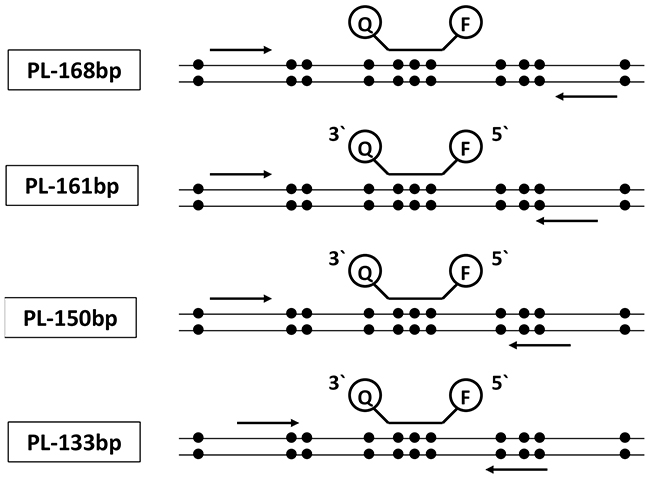 Figure 1: Schematic illustration of the primer and probe localizations related to the presence of CpG sites analyzed in the study, applied in ddPCR alone and in combination with a pre-amplification step. Probes were labelled with FAM for methylated and HEX for unmethylated DNA at the 5′-end and Black Hole Quencer 1 at the 3′-end.