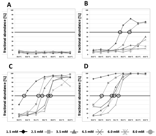 Figure 2: Fractional abundances [%] of methylated DNA fragments of the PLA2R1 gene in relation to the whole analysed DNA (methylated and unmethylated fractions) after 15 cycles of pre-amplification in dependence of MgCl2 concentration and annealing temperature are shown. Bisulfite modified standard DNA were applied as templates for pre-amplification and contained 150 copies of methylated and 150 unmethylated PLA2R1 DNA fragments resulting in an initial fractional abundance of 50%. After pre-amplification, samples were processed on ddPCR. Data were obtained using PL-168 bp primer pair (A), PL-161 bp primers (B), PL-150 bp primers (C), and PL-133 bp primers (D). Circles label the points at which an unbiased pre-amplification was observed. Results are representative data from three independent experiments.