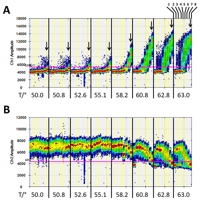 Figure 3: Digital quantification of fluorescence signals in the samples with no or rare number of methylated DNA fragments against a background of 25,000 unmethylated DNA fragments of the PLA2R1 gene after pre-amplification with 2.5 mM MgCl2 for 15 cycles using PL-161 bp primer pair in dependence on annealing temperature. (A) FAM-signals (Ch1 amplitude, positive for methylated DNA fragments) were registered in samples without (1) or with 5 (2), 9 (3), 94 (4), 375 (5), 750 (6), 1.500 (7), and 3.000 (8) copies of methylated DNA fragments (as shown at the top on the right side). The range of annealing temperature was from 50.0°C to 63.0°C. Arrows show the FAM signal amplitudes of samples with 3,000 copies of methylated DNA dependent on annealing temperature. (B) HEX signals (Ch2 amplitude, positive for unmethylated DNA fragments) were registered in the same samples as described in (A). Fluorescence signals are shown as heat map. The used thresholds are shown as red line. Results are representative data from three independent experiments.