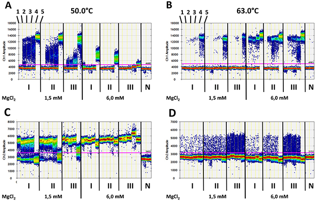 For this reason, we considered pre-amplifying the cfDNA targets prior to ddPCR. In order to generate signal-to-noise ratio in the ddPCR, allowing for a sufficient distinction between true positive signals and background noise, we first analyzed the influence of the primer design in conjunction with Mg2+ levels and the annealing temperature on the resulting PCR bias. For this purpose, ddPCR offered the advantage of calculating absolute values of DNA copies without the use of calibrators [32, 33].