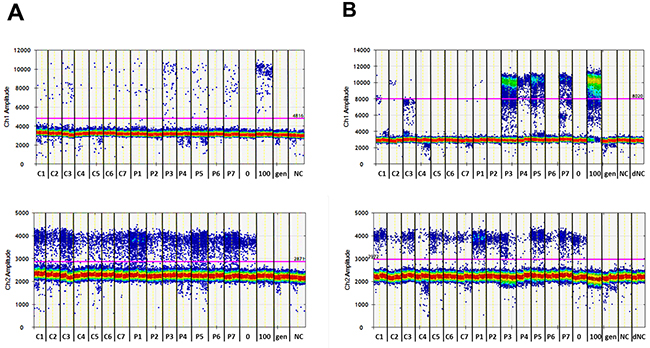 Figure 6: Analyses of the methylation degree of the PLA2R1 promoter in cfDNA isolated from pooled serum samples of healthy individuals (C1-C7) and patients with prostate cancer (P1-P7) using ddPCR alone (A) and the new two-step ddPCR with prior pre-amplification applying primer pair PL-150 bp with 3.5 mM MgCl2 concentration and 60.8°C followed by ddPCR (B). ddPCR plots showing FAM and HEX signals for methylated (upper graphs, Ch1 amplitude) and unmethylated (lower graphs, Ch2 amplitude) PLA2R1 DNA fragments, respectively. Each sample was analyzed in duplicates as shown and are representative of two independent experiments. The used thresholds are shown as red line. 0 and 100, standard DNA with methylation degrees of 0% and 100%; gen, genomic DNA control without bisulfite modification; NC, non-template control for both pre-amplification and ddPCR; dNC, non-template control for ddPCR.