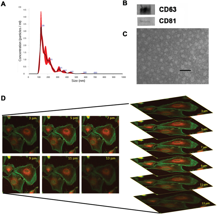 Figure 1: Characterization of EVs isolated from HLSCs. (A) NanoSight size distribution graph showing the quantity and size of HLSC-EVs. (B) Representative Western blot analysis of CD63 and CD81 protein expression in HLSC-EVs. Data represent one of two experiments with similar results. (C) Representative electron microscopy of HLSC-EVs (scale bar = 100 nm). (D) Incorporation of DIL-labelled HLSC-EVs in G7 renal cells after 1 hour of incubation detected by confocal microscopy by z stack program (Original magnification x400).