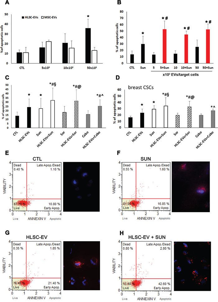 Figure 2: Apoptotic effect of HLSC-EVs on renal and breast CSCs. (A) Analysis of apoptosis of G7 renal CSCs induced by different doses of HLSC-EVs (black column) and BM derived MSC-EVs (white column). G7 renal CSCs were stimulated for 48 hours with different doses of HLSC-EVs or MSC-EVs and Muse Annexin V & Dead Cell Assay evaluated apoptotic cells. (B) Apoptosis analysis of G7 renal CSCs stimulated with 1μM of Sunitinib alone and in combination with different doses of HLSC-EVs (5, 10, and 50 x 103 EVs/target cells) for 48 hours. Data are mean ± SD of five different experiments (A and B): *= p < 0.05 vs CTL cells; # = p < 0.05 vs Sunitinib. (C) Apoptosis analysis of G7 renal CSCs evaluated after 48 hours of treatment with HLSC-EVs (50 x 103 EVs/target cells), Sunitinib (1μM), Sorafenib (5μM) and Cabozantinib (2μM) alone or in combination (HLSC-EVs+Sun, HLSC-EVs+Sor, HLSC-EVs+Cabo). (D) Apoptosis analysis of C10 breast CSCs stimulated for 48 hours with HLSC-EVs (50 x 103 EVs/target cells), Sunitinib (1μM), Sorafenib (5μM) and Cabozantinib (2μM) alone or in combination (HLSC-EVs+Sun, HLSC-EVs+Sor, HLSC-EVs+Cabo). Data are mean ± SD of three different experiments (C and D): *= p < 0.05 vs CTL; # = p < 0.05 vs HLSC-EVs; § = p < 0.05 vs Sunitinib; @ = p < 0.05 vs Sorafenib; ^ = p < 0.05 vs Cabozantinib. (E-H) Representative cytofluorimetric analysis of dead and apoptotic cells as evaluated by Muse™ Annexin V and Dead Cell Assay and immunofluorescence images of Annexin V staining of renal CSCs when treated with HLSC-EV, Sunitinib alone or their combination. Nuclei are stained with Hoechst 33342 (blu). (Original magnification x400).