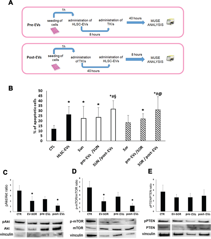 Figure 6: Effect of HLSC-EVs and TKIs sequential administration on G7 renal CSCs apoptosis. (A) Schematic representation of the sequential administration experiment. Pre-EVs: G7 renal CSCs were incubated with HLSC-EVs for 8 hours and then stimulated with Sunitinib (1 μM) or Sorafenib (5 μM) for additional 40 hours. Post-EVs: G7 renal CSCs were stimulated with Sunitinib or Sorafenib for 40 hours and then stimulated with HLSC-EVs for additional 8 hours for a total of 48 hours of incubation. (B) Apoptosis analysis of G7 renal CSCs after 48 hours of sequential treatment. Data are mean ± SD of three different experiments: *= p < 0.05 vs CTL; # = p < 0.05 vs HLSC-EVs; § = p < 0.05 vs Sunitinib; @ = p < 0.05 vs Sorafenib. (C-E) Western blot micrograph and densitometric analysis of pAkt/Akt (C), p-mTOR/mTOR (D) and pPTEN/PTEN (E) ratioon CSCs after sequential administration of HLSC-EVs (3 hours) and Sorafenib (40 hours). Data, shown as arbitrary units, were representative of three different experiments and were normalized to vinculin expression: *= p < 0.001 vs CTL.
