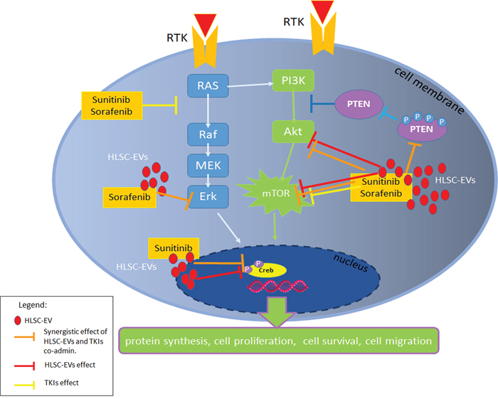 RCC: Renal Cell Carcinoma; CSC: Cancer Stem Cells; HLSC: human liver stem cells; EV: extracellular vesicles; TKI: tyrosine kinase inhibitor; SUN: sunitinib; SOR: sorafenib; MSC: mesenchymal stem cells; RTK: tyrosine kinase receptor; PTEN: phosphatase and tensin homolog; mTOR: mammalian target of rapamycin; Akt: protein chinase B or PKB; PI3K: phosphoinisitide 3-kinase; Erk: extracellular signal-regulated kinases.