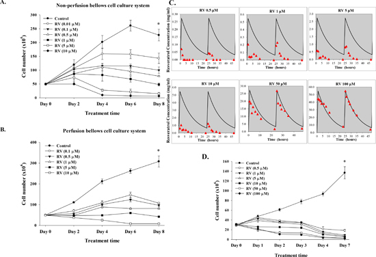 Figure 4: Resveratrol induces anti-proliferation in breast cancer MDA-MB-231 cells. Cells were cultured in (A) non-perfusion (B) perfusion bellows cell culture system with 10% fetal bovine serum in culture medium for 8 d. Different concentrations (0.01 to 10 μM) of resveratrol were added in culture media daily, together with refreshed medium. Cells were harvested and cell numbers were counted every other day. Points, mean; bars, ± SD; N = 4 (C) Short-term exposure to resveratrol induces anti-proliferation of cancer cells in the perfusion bellows cell culture system. Determination of resveratrol concentration was performed by LC/MS/MS. Cells were cultured in the system with 10% fetal bovine serum in culture medium. Different concentrations of resveratrol were added in culture media daily by syringe pump in 1 h and no fresh resveratrol in influx medium for the another 23 h. One ml of medium was drawn from the efflux tube of the central reservoirs at different time points. Samples were stored at −20°C until examination. Concentrations of resveratrol were measured by LC/MS/MS as described in the Materials and Methods. N = 2. (D) Pharmacodynamic studies of resveratrol-induced anti-proliferation in perfusion bellows cell culture system. Cells were cultured in the perfusion bellows culture system with 10% fetal bovine serum in culture medium for 6 d. Different concentrations of resveratrol were added in culture media daily by syringe pump in 1 h and there was no fresh resveratrol in the influx medium for another 23 h; the final concentrations in the media were 0.5 to 100 μM. Cells were harvested and cell numbers were counted every day. N = 3 (*p < 0.05, compared to control with vehicle solvent)