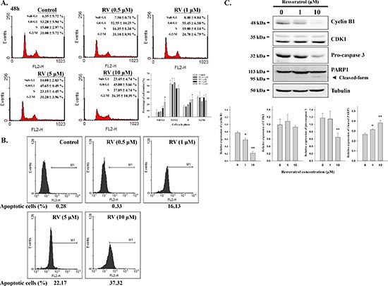 In order to determine the effect of resveratrol-induced apoptosis and cell cycle arrest, cells were treated with different concentration of resveratrol for 24 h. Cells were harvested and flow cytometry was conducted. Resveratrol increased the fraction of cells in S phase from 15.80 ± 2.97% in control to 27.85 ± 4.74% at the 48 h time point in a concentration-dependent manner (Fig. 5A). Cells in G1 and G2/M phases were slightly decreased after resveratrol treatment indicating that resveratrol may induce S phase growth arrest in MDA-MB-231 cells. Resveratrol also induced apoptosis in a concentration-dependent manner (Fig. 5A and B), which may result from modulation of cell cycle progression. Resveratrol inhibited MDA-MB-231 cell proliferation and increased the fraction of cells in sub-G1 by 23.45 ± 4.74%, compared to untreated control. Furthermore, the effects of resveratrol on cyclin B1, CDK1, caspase 3, and PARP1 were also addressed. Results indicated that 10 μM resveratrol significantly inhibited cyclin B1 expression, decreased the content of caspase 3, and activated PARP1 (Fig. 5C).