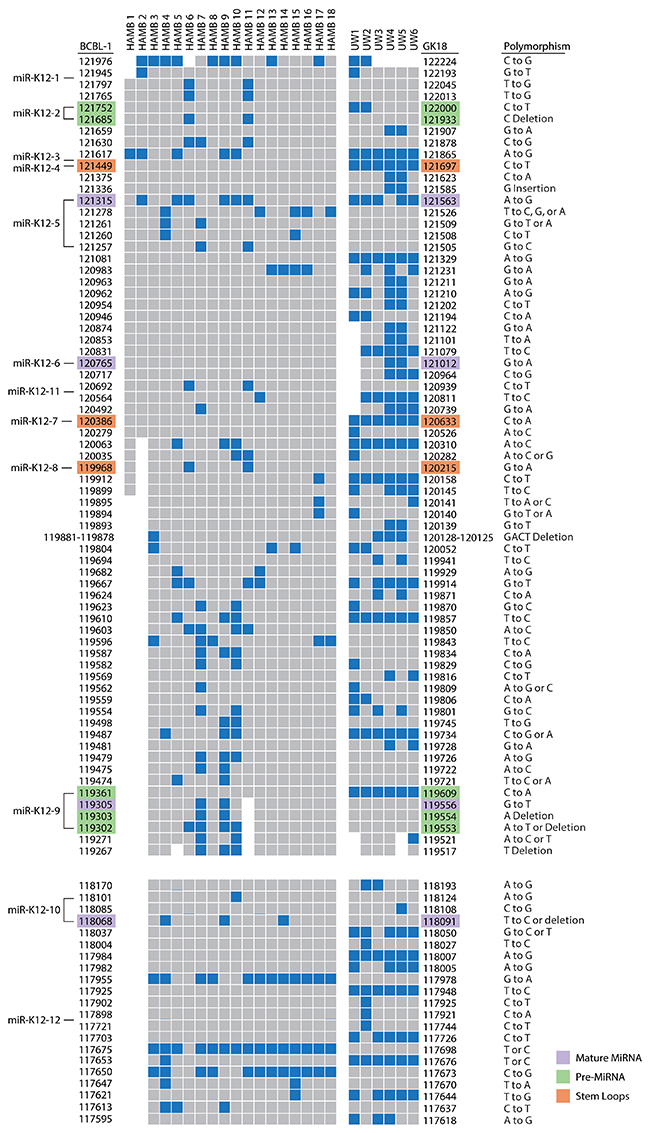 Figure 2: Map of polymorphisms occurring in the microRNA cluster region (top) and the K12/T0.7 gene (bottom). Polymorphisms, as indicated in blue, were defined by sequence comparison to the BCBL-1 cell line as noted on the left of columns; the GK18 cell line is referenced on the right. Specific locations of polymorphisms in relation to reference sequence are noted with nucleotide positions. Areas of missing sequence are shown as gaps. Location of SNPs within microRNA structures are color coded as indicated. Abbreviations: UW=samples from University of Witwatersrand, South Africa. HAMB=samples from the HIV and AIDS Malignancy Branch. BCBL-1 and GK18 GenBank accession number referenced are AY973824.1 and AF148805.2 respectively.