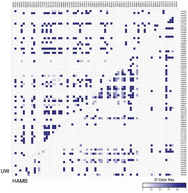 In turn, while the microRNA cluster sequence was highly conserved, the pattern of SNPs in KSHV strains from South African and HAMB patients were distinct. Polymorphisms from each group were examined for linkage using VCFtools [17]. Analysis indicated that some SNPs were non-random and linked within groups, and the pattern differed between UW and HAMB as shown in Figure 3.