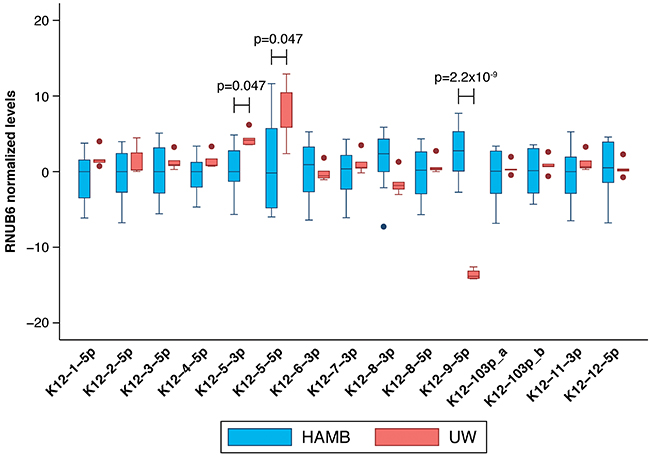 Analysis of viral mature microRNA expression revealed that all KSHV mature microRNAs examined were detected at elevated levels in KS tissues compared to control skin except for K12-9-5p and the star sequence K12-5-5p*. We included all 13 predominantly expressed mature KSHV microRNAs and two star sequences, identified in previous studies as important, in our current analysis [8, 14, 15]. Upregulation of KSHV microRNAs in KS has been previously reported [22]. Mature microRNA expression was observed in every KS biopsy in the current study. KSHV mature microRNA expression levels differed between the HAMB and UW groups, correlating with sequence differences between the two groups consistent with our previous in vitro observations [16]. Differences in mature microRNA levels in KS lesions from South Africa compared to US patients were not related to KSHV viral load or any other patient-related factor.