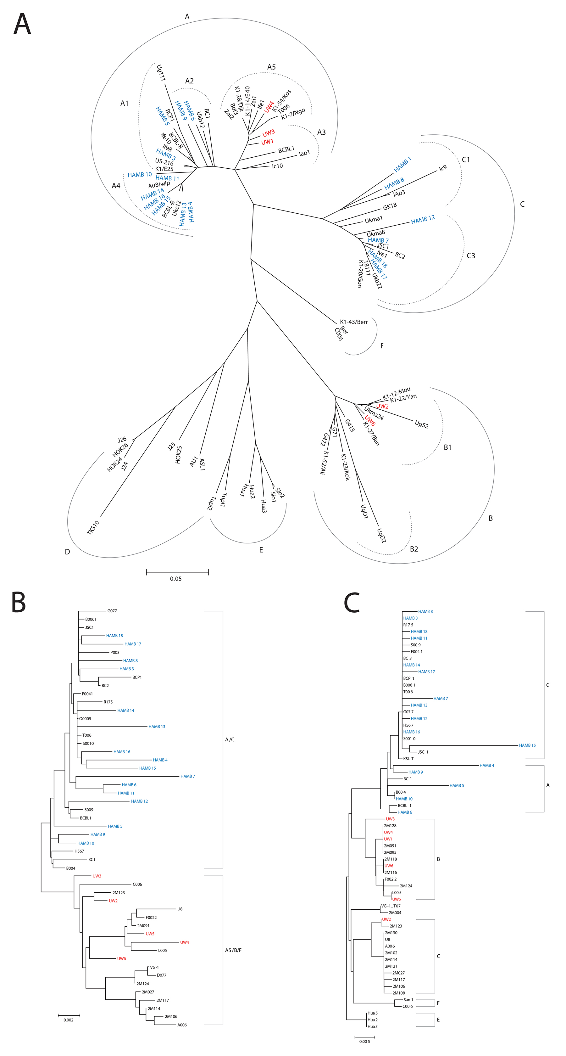 US patients, enrolled at the HIV and AIDS Malignancy Branch (HAMB) of the NCI, all had KSHV K1 A or C subtype sequences; while South African patients, from the University of Witwatersrand (UW), had KSHV A5, B, or F subtypes, as summarized in Table 1 and as shown in Figure 1A. K1 subtype was not identified in UW5 despite numerous amplification attempts with multiple K1 primer sets, possibly due to sequence variation. K1 subtype was also not determined for HAMB2 due to low viral copy.