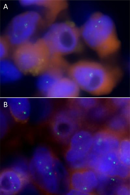 Figure 1: FISH analysis showing deletion of NF-2 gene in an MPMN. (A) Loss of one red and one green signal in >50% of tumor cells was interpreted as deletion of 22q. Normal amounts of 22q (two red NF2 and two green CEN22q signals in >50% of nuclei) are also shown (B).