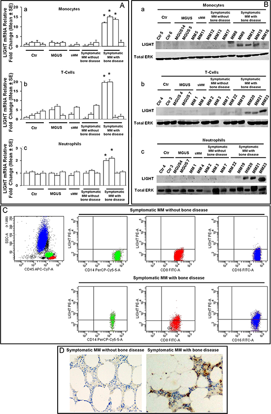 Figure 1: LIGHT expression in patients and controls. Monocytes, T-cells and neutrophils from peripheral blood of controls (ctr), MGUS, smoldering MM (sMM) and symptomatic MM patients without or with bone disease were assessed for LIGHT expression by real-time PCR (A), western blotting (B) and flow cytometry (C). LIGHT immunostaining was performed in bone marrow biopsies (D). The lowest mRNA levels of LIGHT were detected in monocytes (Aa), T-cells (Ab) and neutrophils (Ac) from controls, MGUS, sMM and symptomatic MM patients without bone disease. As compared with all of them, LIGHT mRNA higher levels of 11-fold (P < 0.0001) in monocytes (Aa), 9.2 fold (p < 0.001) in T-cells (Ab) and 1.8- fold (p < 0.01) in neutrophils (Ac) were detected in symptomatic MM patients with bone disease. In these latter, high levels of LIGHT protein were detected by western blotting in 90% of monocytes (Ba), 50% of T-cells (Bb) and 50% of neutrophils (Bc), whereas the samples of symptomatic MM patients without bone disease, sMM, MGUS and controls did not display a detectable LIGHT protein amount. Flow cytometry dot plots showed LIGHT expression on CD14+ monocytes, CD8+ T-cells and CD16+ neutrophils from a representative symptomatic MM patient without bone disease, and a symptomatic MM patient with bone-disease; in particular, LIGHT levels were higher in the former than in the latter (C). LIGHT positive immunostaining was also observed in the bone marrow biopsy from a representative symptomatic MM patient with bone-disease; conversely, LIGHT resulted negative in a symptomatic MM patient without bone-disease (D). The photomicrographs were obtained using a Nikon Eclipse E400 microscope equipped with a Nikon plan Apo 20×/0.75 DICM (Nikon, Italia), Magnification 200X.
