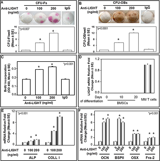 Figure 3: Anti-LIGHT mAb effect on CFU-F and CFU-OB formation in BMNC cultures of MM-bone disease patients. (A) CFU-F and (B) CFU-OB detected in bone marrow nuclear cell (BMNC) cultures from MM-bone disease patients, in the absence (0) or presence of 100 or 200 ng/ml anti-LIGHT neutralizing mAb. The results were compared to those obtained from untreated BMNC cultures. Anti-LIGHT mAb significantly increased CFU-F (A) and CFU-OB (B) formation in a dose-dependent manner. No effect was detected in the presence of a control anti-IgG mAb. The graphs represent the mean number of CFU-F/well or CFU-OB/well ± SE of 6 independent experiments performed in triplicate. (C) 5-bromo-2-deoxyuridine (BrdU) incorporation evaluated in BMNC cultures from MM-bone disease patients, treated or not with 100 and 200 ng/ml anti-LIGHT mAb, which positively affected cell proliferation. The graph represents BrdU incorporation evaluated in 6 experiments performed in quadruplicate. (D) Purified bone marrow stromal cells (BMSCs) cultured in osteogenic medium for 0, 10 and 20 days did not express LIGHT mRNA. The positive control was represented by T-cells from MM-bone disease patients. (E) Anti-LIGHT mAb increased the expression at mRNA level of Alkaline Phosphatase (ALP) and Collagen-I (COLL-I). (F) Anti-LIGHT mAb increased the expression at mRNA level of osteocalcin (OCN), bone sialoprotein II (BSP II), Osterix (OSX) and Fra-2. The graphs show 6 real-time PCR experiments performed in triplicate.