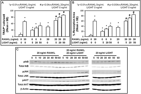 Figure 4: LIGHT pro-osteoclastogenic effect. LIGHT treatment of cultures of PBMCs from healthy-donors resulted in dose-dependent increase of OC formation (A) and resorption activity (B). These effects were more evident after culture treatment with both RANKL and LIGHT. TRAP+ OC number (A), and resorption area percentage (B) were assessed, and the results represented the mean ± SE of 12 independent experiments. (C) Western blot analysis of phosphorylated AKT, JNK, IKB in pre-osteoclasts from healthy-donors incubated with RANKL, RANKL + LIGHT, or LIGHT over a time course (0 to 60 min).