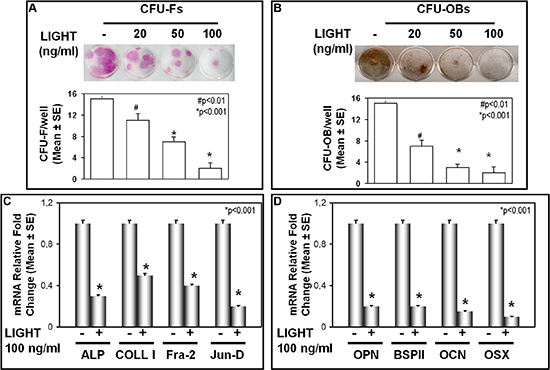 Figure 5: LIGHT effect on CFU-F and CFU-OB formation. (A) CFU-F and (B) CFU-OB formation were detected in BMNC cultures from MGUS and non-neoplastic patients in the absence (0) or presence of 20, 50 or 100 ng/ml LIGHT. The results were compared to those obtained from parallel untreated cultures. LIGHT significantly inhibited both CFU-F (A) and CFU-OB (B) formation in a dose-dependent manner. The graphs represent the mean number of CFU-F/well or CFU-OB/well ± SE of 6 independent experiments performed in triplicate. (C) LIGHT inhibited the expression at mRNA level of Alkaline Phosphatase (ALP), Collagen-I (COLL-I), Fra-2 and Jun-D. (D) LIGHT significantly inhibited the expression at mRNA level of osteopontin (OPN), bone sialoprotein II (BSP II), osteocalcin (OSC) and Osterix (OSX). The graphs show 6 real-time PCR experiments performed in triplicate.