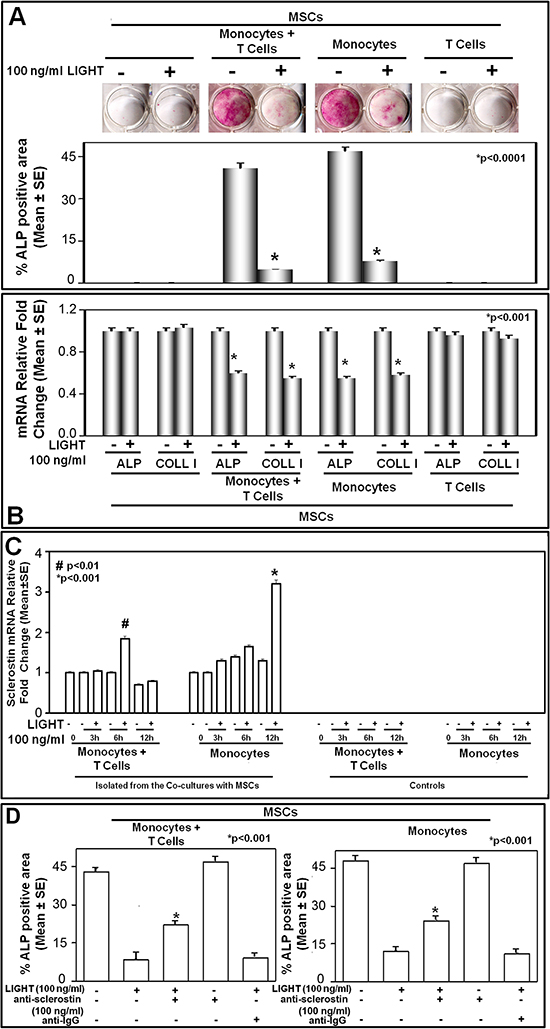 Figure 6: LIGHT effect on osteoblastogenesis in co-cultures of mesenchymal stem cells and monocytes with or without T-cells. (A) For 8 days in osteogenic medium and in the presence or absence of 100 ng/ml LIGHT, mesenchymal stem cells (MSCs) were cultured alone or co-cultured with monocytes + T-cells, monocytes, or T-cells, respectively. In co-cultures of MSCs with either monocytes + T-cells or monocytes alone, LIGHT significantly inhibited the differentiation of Alkaline Phosphatase positive (ALP+) osteoblasts. The graphs represent the mean percentage of ALP positive area/well ± SE of 5 independent experiments performed in triplicate. (B) In the same conditions, LIGHT inhibited the expression, at mRNA level, of Alkaline Phosphatase (ALP) and Collagen-I (COLL-I) in co-cultures of MSCs with monocytes + T-cells, or monocytes alone, respectively. (C) In the absence or presence of 100 ng/ml LIGHT over a time course [0 to 12 hours (h)], cultures of monocytes + T-cells or monocytes alone as well as co-cultures of MSCs with monocytes + T-cells, or monocytes alone were performed. Thereby, sclerostin expression was evaluated in the cell extracts from each co-culture consisting of monocytes + T-cells or monocytes alone. The results showed a significant sclerostin up-regulation occurring at 6 hours in the co-coltures of MSCs with monocytes + T-cells, and at 12 hours in those of MSCs with monocytes alone. (D) For 8 days in osteogenic medium and in the presence or absence of 100 ng/ml LIGHT and/or 100 ng/ml anti-sclerostin mAb, mesenchymal stem cells (MSCs) were cultured alone and co-cultured with monocytes + T-cells or monocytes, respectively. By treating the above described co-cultures simultaneously with LIGHT and a neutralizing anti-sclerostin mAb, LIGHT inhibitory effect on the differentiation of ALP+ osteoblasts was partially reverted.