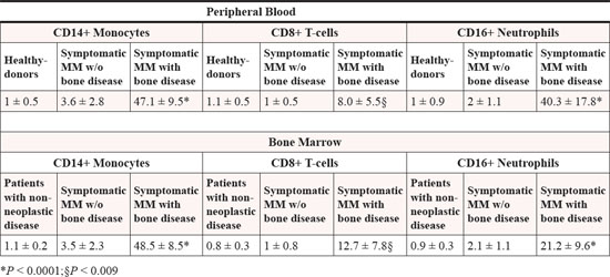 Firstly, we detected high LIGHT expression in CD14+ monocytes, CD8+ T-cells and CD16+ neutrophils from PB and BM of newly diagnosed patients with MM-bone disease. Conversely, we found a low or undetectable expression of LIGHT in the other samples from patients affected by symptomatic MM without bone disease, sMM, MGUS, non-neoplastic disease and in healthy-donors.