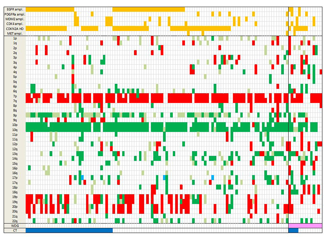 SNP array was performed on the 123 cases. The most frequent CNA were chr 10q loss (106/123, 86.2%), chr 7p gain (92/123 (74.8%), including 89 cases with additional 7q gain), chr 9p loss (77/123, 62.6%), and chr 19 and 20 co-gain (23/123, 18.7%) (Figure 1). CDKN2A homozygous deletion and EGFR amplification were the most frequent recurrent focal alterations, detected in 71 (71/123, 57.7%) and 53 cases (53/123, 42.3%), respectively. CDK4 amplification was found in 19 GBM (16/123, 15.4%), MDM2 amplification in 11 tumors (11/123, 8.9%), and MET amplification in 4 GBM (4/123, 3.2%).
