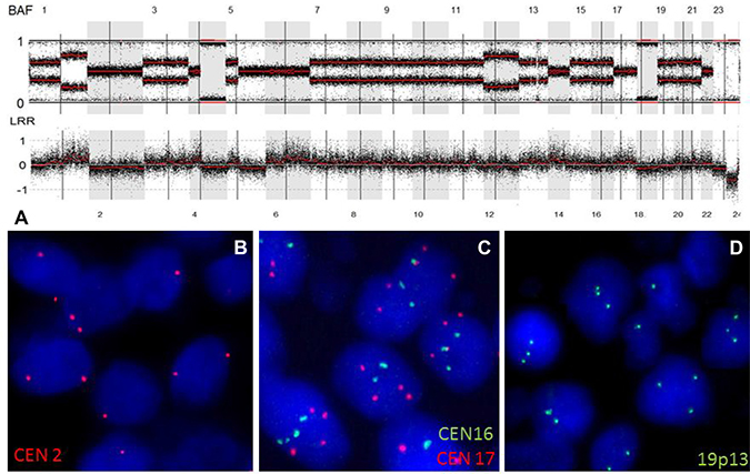 Figure 2: WGD in an IDH-wild-type GBM. (A) SNP array profile (GAP method) showing a near tetraploid genome characterized by marked allelic imbalance. Chr 2 displayed a LogR ratio below 0 (2 DNA copies), with a heterozygous allelotype; chr 17 had a LogR ratio above 0 (4 DNA copies), with a heterozygous allelotype; chrs 16 and 19 displayed a LogR ratio near 0 (3 DNA copies). (B) FISH picture showing the presence of two copies of chr 2 (red signals). (C) FISH picture showing the presence of four copies of chr 17 (red signals) and three copies of chr 16 (green signals). (D) FISH picture showing the presence of three copies of chr 19q13 (green signals). Abbreviations: BAF, B-allele frequency; LRR, LogR Ratio; CEN, centromere.