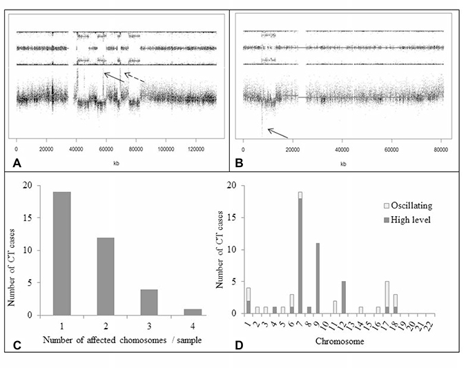 Figure 4: Occurrence of CT. (A) SNP array profile (GAP method) showing a CT pattern on chr 12q with multiple amplifications involving, among others, MDM2 and CDK4 genes (dotted and solid arrows, respectively). Note interspersed loss and retention of heterozygosity with no more than three different copy number states except for focal amplifications. (B) SNP array profile (GAP method) showing a CT pattern on chr 17p with TP53 homozygous deletion (arrow). (C) Number of chrs affected by CT per GBM sample. In most cases, CT involved only one or two chrs. (D) CT occurrence across the whole genome in the 123 GBM. High-level event indicates gene amplification (³ 4 copies) or homozygous deletion (no copy); oscillating pattern indicates alternating copy number states (1, 2 or 3) without amplification or homozygous deletion of genomic regions. High-level events were more frequent than oscillating patterns. CT mostly involved chrs 7, 9, and 12, which harbor key oncogenes or tumor supressor genes in GBM. Abbreviations: CT, chromothripsis.