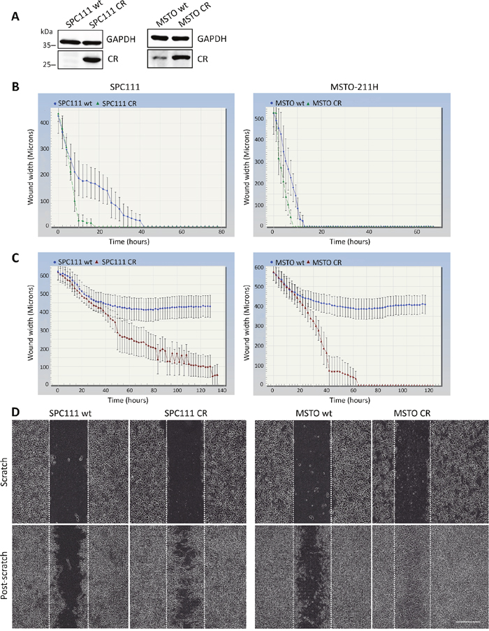 Figure 1: CR overexpression promotes migration and invasion in vitro. (A) Western Blot analysis demonstrating lentiviral-mediated CR overexpression in SPC111 and MSTO-211H cells. GAPDH was used as loading control. (B) Comparison of wound closure kinetics between wt (blue) and CR- overexpressing cells (green) shown for SPC111 and MSTO-211H cells monitored with the IncuCyte™ imaging system every 2 h. A faster closing of the scratch is observed for CR-overexpressing cells when compared with wt cells. (C) Invasiveness determined by a modified ‘wound healing assay’ with an added matrix barrier component (Matrigel™). Comparison of wound closure kinetics between wt (blue) and CR-overexpressing cells (red). CR-overexpressing SPC111 and MSTO-211H cells completely closed the wound after 90 h and 60 h, respectively. Neither of the wt cells were capable of closing the gap during the observation period (140 h; n = 4 independent experiments). (D) Representative examples of time-lapse images taken after confluent monolayers of SPC111 and MSTO-211H (wt and CR-overexpressing cells) were scratched (time point 0 h), and after 90 h and 60 h (post-scratch), respectively. Scale bar: 400 μm.