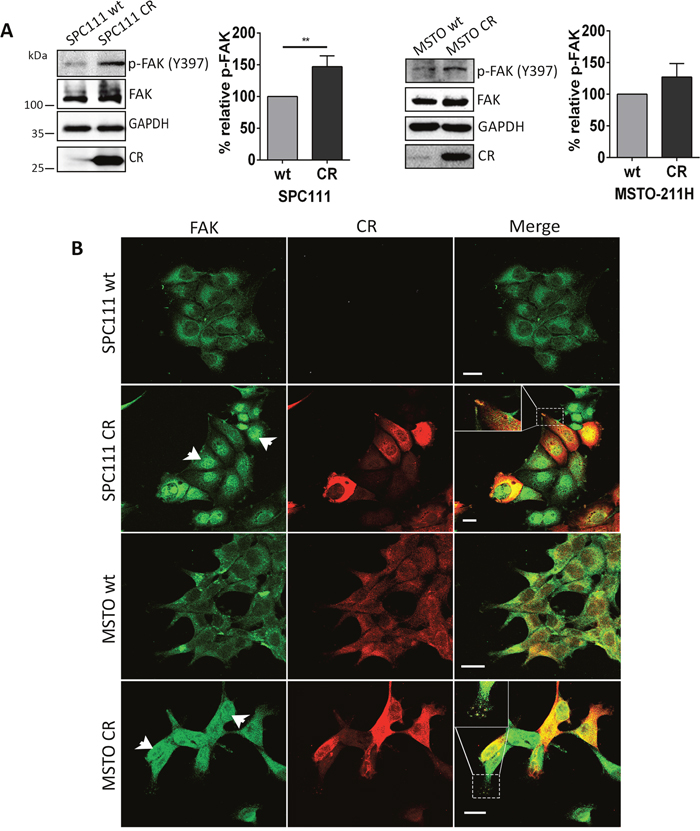 Figure 2: CR overexpression leads to FAK up-regulation and altered FAK localization. (A) Western Blot analysis of CR-overexpressing and wt MM cells revealed up-regulation of total FAK and p-FAK (Tyr397) in SPC111 and MSTO-211H cells. Protein size markers are shown in the first Western Blot of the figure. GAPDH was used as loading control. Quantification of Western Blot signals for p-FAK (Tyr397) is shown. p-FAK (Tyr397) signals were increased by ≈50% in SPC111-CR and ≈40% in MSTO-CR with respect to the corresponding wt cells (**p ≤ 0.01; n = 3 independent experiments). (B) Representative confocal images from fixed cells stained for FAK (green) and CR (red) in wt and CR-overexpressing cells. In both cell lines CR co-localized with FAK (represented by yellow color in the merged images) in some parts of the cytosolic region and at the leading edge of cells forming punctate-like patterns (focal adhesions) along the plasma membrane. An enlarged image is shown on the top left of the merged image. CR-overexpressing cells exhibit nuclear FAK accumulation (arrowheads). Scale bar: 20 μm.
