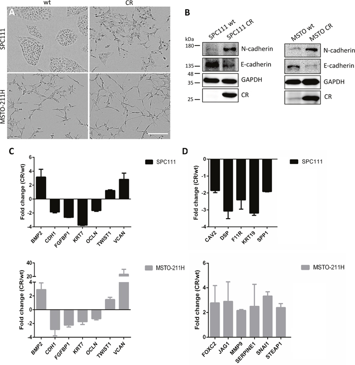 Figure 4: CR overexpression in MM cells induces EMT. (A) Representative images of wt and long-term CR-overexpressing MM cells. SPC111-CR cells showed loss of the typical clustered morphology and cell scattering. MSTO-CR cells exhibited an increased spindle-like phenotype. Scale bar: 400 μm. (B) Western Blot analysis of the epithelial marker E-cadherin and the mesenchymal marker N-cadherin in wt and CR-overexpressing cells. CR overexpression induced a reduction of E-cadherin and an increase in N-cadherin when compared with wt cells. GAPDH was used as loading control. (C) Relative fold-change of transcript expression determined by an EMT pathway-specific PCR array (mean ± SD from 2-3 independent experiments). Transcripts similarly up- and downregulated in both SPC111-CR (black) and MSTO-211H-CR (gray) in comparison to their wt cells are shown in (C); differently expressed transcripts in either MM cell line are shown in (D)