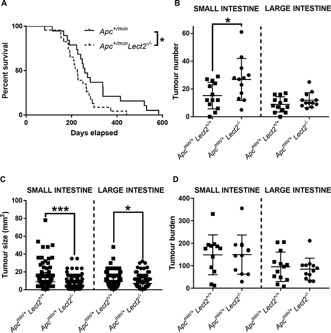 Lect2 has been implicated as a novel Wnt repressor and a potential tumour suppressor in CRC [4]. In order to test this hypothesis we crossed the Lect2−/− allele [5] onto an ApcMin/+ background. The ApcMin/+ mouse model is a well-established CRC model that is heterozygous for a mutation in the Apc gene and develops multiple intestinal neoplasia. Cohorts of at least 15 experimental and control mice were aged and the mice were monitored regularly for signs of intestinal tumours (rectal bleeding, prolapse, anaemia) or other illness and were taken for analysis when they became symptomatic of disease. Comparison of the endpoint demonstrated the mean survival of ApcMin/+Lect2−/− (239 days; N = 23) was significantly shorter than in the control ApcMin/+Lect2+/+ (308 days; N = 19) cohort (Log-rank (Mantel-Cox) test, P = 0.042) (Figure 1A). All cohorts developed adenomas within the small intestine and the large intestine, with no other Apc+/min associated clinical phenotypes observed. The decrease in survival of ApcMin/+Lect2−/− mice correlated with a significantly increased number of adenomas in the small intestine compared to the ApcMin/+Lect2+/+ mice at death (mean of 26.8 tumours versus 15.2 tumours, Mann–Whitney U-test, P = 0.0138; Figure 1B). No significant difference was seen in the number of adenomas in the large intestine. By contrast, a significant reduction in mean tumour size was observed in the ApcMin/+Lect2−/− cohort, both in the small (5.6 mm2 versus 8.9 mm2, Mann–Whitney U-test, P = 0.0001) and large (7.1 mm2 versus 9.2 mm2, Mann–Whitney U-test, P = 0.0038) intestine (Figure 1C). As further analysis of intestinal tumour burden at survival endpoint (Figure 1D) indicated no significant difference between cohorts the reduction of mean tumour size in the ApcMin/+Lect2−/− is likely a reflection of the animals’ shortened longevity.