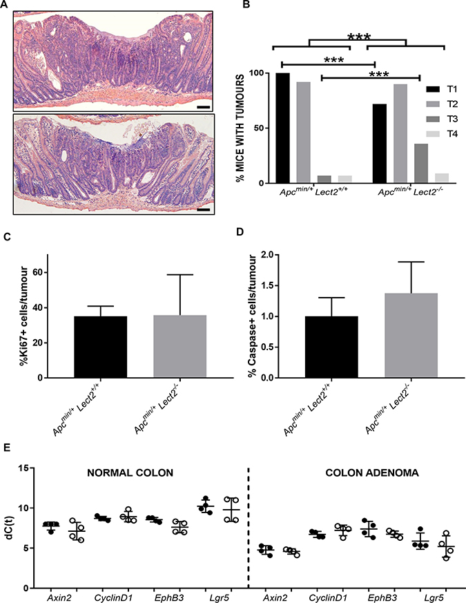 To gain a clearer understanding of the decrease in survival seen in the ApcMin/+Lect2−/− cohort and to fully characterise the effect of Lect2 loss on the ApcMin/+ phenotype we histologically characterised the small intestine and the large intestine tumours of both the ApcMin/+Lect2+/+ and the ApcMin/+Lect2−/− cohorts (Figure 2A). Tumours were classified as microadenomas (T1); adenomas (T2); early invasive adenocarcinomas showing invasion into the submucosa but not the muscularis propria (T3); and advanced invasive adenocarcinoma that penetrated into or through the muscularis propria (T4). The control (ApcMin/+Lect2+/+) mice had benign microadenomas T1 (Figure 2A (top panel); n = 13/13; 100%) and T2 adenomas (n = 12/13; 92.3%), with rare T3 adenocarcinomas (n = 1/13; 7.7%) or T4 tumours invading into the muscularis propria (n = 1/13; 7.7%; Figure 2B). The ApcMin/+Lect2−/− displayed a significant shift in progression with a reduction in the percentage of mice with early T1 lesions to 72.8% (n = 8/11) with a corresponding increase in early invasive T3 lesions to 36.4% (n = 4/11) (Chi-Squared Test P < 0.0001; Figure 2A (bottom panel) and 2B). To understand whether progression was due to alteration in cell homeostasis we next performed immunohistochemical analysis for Ki67, a marker of proliferation, and cleaved Caspase-3, a marker of apoptosis. The percentage of positively-staining cells in tumours of both the ApcMin/+Lect2+/+ (N = 4) and ApcMin/+Lect2−/− (N = 5) cohorts indicated that loss of Lect2 had no significant effect on either cell proliferation (Figure 2C) or cell death (Figure 2D) in our Wnt-driven tumours. To address the Wnt-inhibitory function of Lect2 we used qRT-PCR analysis to compare the expression of Wnt targets in tissue isolated from the ApcMin/+Lect2+/+ (N = 4) and ApcMin/+Lect2−/− (N = 4) cohorts. Whilst we were able to show the previously characterised induction of downstream Wnt targets during Wnt-driven tumorigenesis, the additional loss of Lect2 had no significant effect on the expression of key Wnt target genes (Figure 2E). Taken together this indicates that the homozygous loss of Lect2 enhances tumour initiation and progression in the ApcMin/+ model independently of an effect on the Wnt pathway.