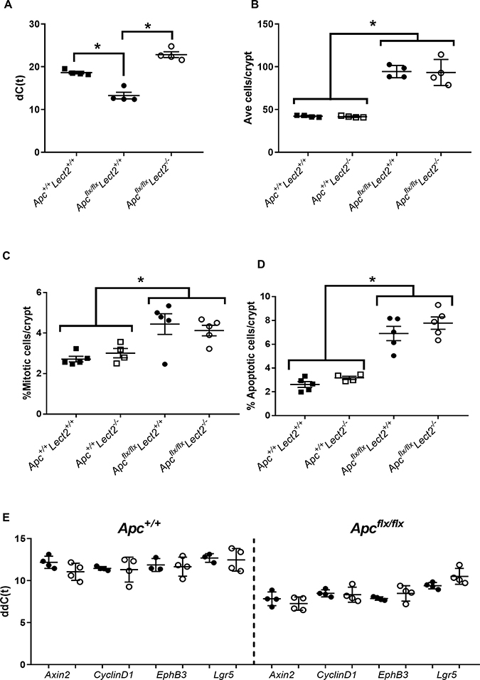Figure 3: Combined loss of Apc and Lect2 in the mouse small intestine has no significant effect on the Apc homozygous phenotype. (A) qRT-PCR analysis of Lect2 expression 4 days following deletion of Apc. The data shown is in terms of the dC(t) values used to calculate the ddC(t) fold-change values. Analysis of crypt cell number (B), mitosis (C) and apoptosis (D) from H&E-stained histological sections of mouse small intestine indicated the alterations characteristic of acute Apc loss are unaffected by additional loss of Lect2 (data shown are means ± S.D. of a minimum of 25 whole crypts from four independent experiments; Mann–Whitney *P < 0.05). (E) qRT-PCR analysis of down-stream Wnt-targets from Lect2+/+ (●) and Lect2−/− (○) mice indicating Lect2 deficiency doesn’t alter expression of Wnt target genes in the normal or Apcfl/f small intestine.