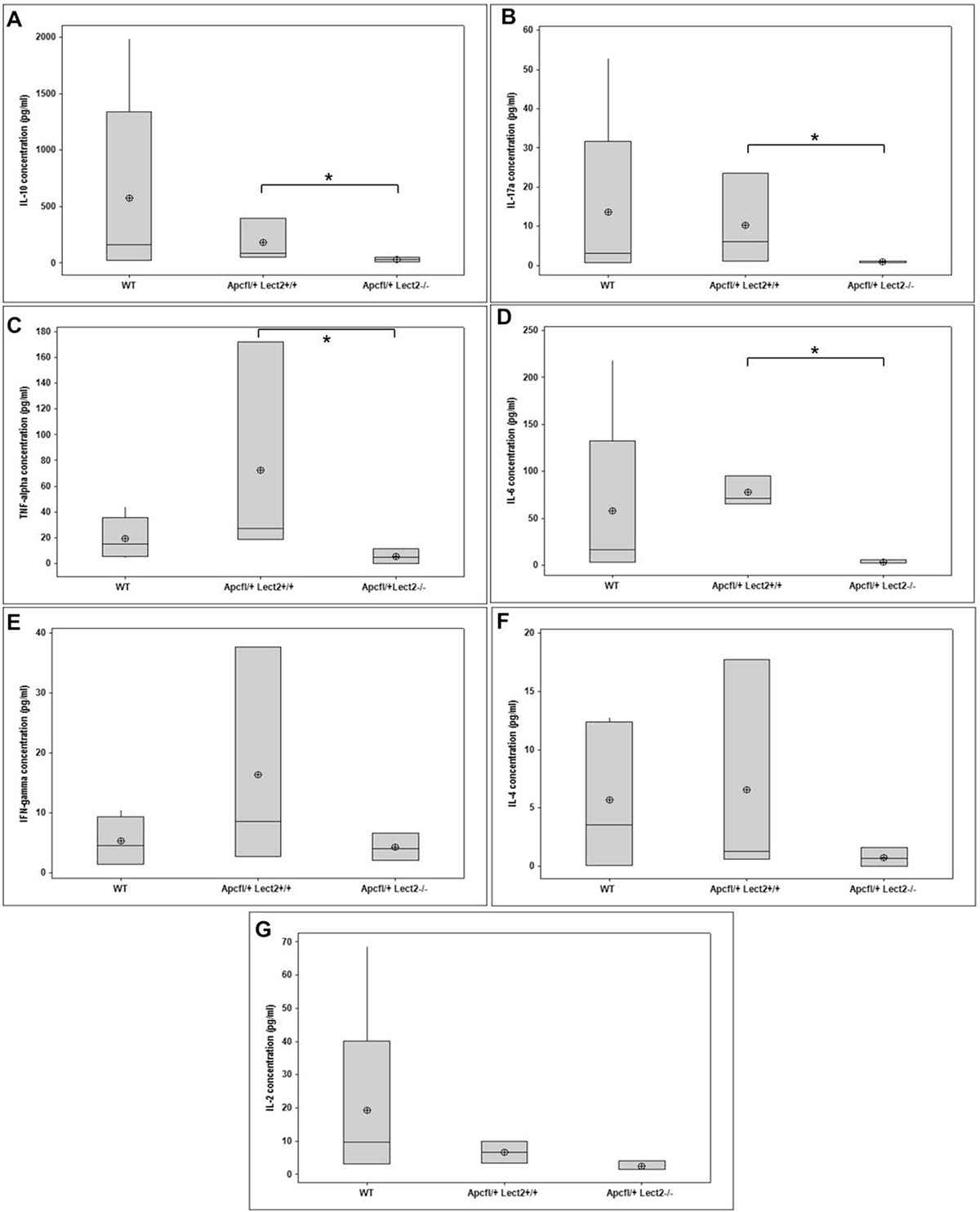 Figure 4: Loss of Lect2 alters the circulating concentration of key cytokines. ELISA analysis indicating a general decrease in circulating cytokines in serum from WT, AhcreApc+/fl and AhcreApc+/flLect2−/− at 55 d.p.i. for IL-10 (A), IL-17 (B), TNF-alpha (C), IL-6 (D), Ifng (E), IL-4 (F), and IL-2 (G) (data shown are means ± S.D. of a minimum of four independent experiments (all N = 5). *Mann–Whitney *P < 0.05).