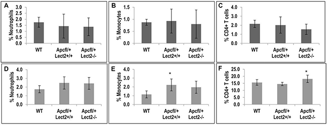 Figure 5: Loss of Lect2 significantly up-regulates the CD4+ T cell population. (A–F) FACS analysis of mononuclear cells in liver and spleen from AhCre+Apcfl/+Lect2+/+ and AhCre+Apcfl/+Lect2−/− at 55d.p.i. The graphs represent the percentage of cells gated on CD45+ cells in either the liver (A–C) or the spleen (D–F) (data shown are means ± S.D. of a minimum of four independent experiment, all N = 5 Mann–Whitney *P < 0.05).
