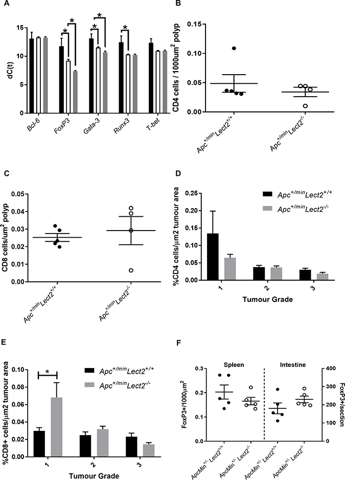 Figure 6: Lect2 regulates the expression of lineage-specification factors in the spleen. (A) qRT-PCR analysis of tissue expression of key transcription factors in AhCre+Apc+/flxLect2+/+ (white bars) and AhCre+Apc+/flxLect2−/− (grey bars) compared to the normal splenic tissue from AhCre+Apc+/+Lect2+/+ mice (black bars) (data shown is in terms of dC(t) values used to calculate ddC(t) fold change) (Mann–Whitney *P < 0.05. Quantification of CD4+ (B) and CD8+ (C) cells in small intestinal polyps. Quantification of CD4+ (D) and CD8+(E) cells indicates an increase in the density of CD8+ cells inT1 stage tumours from Apc+/minLect2−/− mice compared to control Apc+/min mice (all N = 4; *Mann–Whitney P > 0.05). Quantification of CD3+FoxP3+ Treg cells in spleen and small intestine (F).