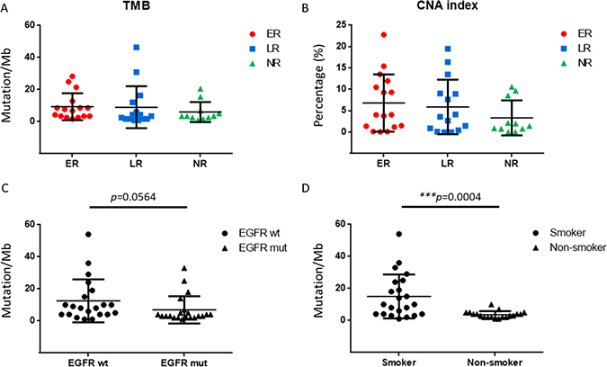 For the 440-gene panel, sequencing raw reads were mapped to the hg19 human reference genome using Torrent Suite Server version 5.2, base calling and variant calling were performed with the Torrent Suite Variant Caller plug-in version 5.2. The Ion Torrent default pipeline and parameters were used for data analysis. Variants reported in 1000 Genomes Project Phase 3 with > 1% minor allele frequency (Asian populations) were considered as polymorphisms and excluded from further analysis. Variants detected in 25 peripheral blood mononuclear cell (PBMC) in-house samples from healthy volunteers were also disregarded as SNPs or technical errors. Variants with coverage ≥ 25, allele frequency ≥ 5% were retained. CNV was analyzed using ONCOCNV (https://github.com/BoevaLab/ONCOCNV) [54]. The diploid reference baseline was established according to our in-house PBMC samples from healthy volunteers. ADTEx was applied for estimating tumor purity and correcting baseline shifts based on SNP information [55]. Copy number amplification was defined as an observed copy number ≥ 10, whereas copy number loss was defined as an observed copy number ≤ 1. Paired primary tumor and normal lung tissue samples were compared to identify tumor somatic mutations. TMB was calculated according to the number of detected mutations and the number of analyzed base pairs (1.166 Mb). CNA index was calculated by the percentage of the regions of genes altered in a tumor and the total regions of the genes that covered in the test on the chromosome to measure degree of genomic instability across the entire genome of a tumor. Statistical analysis of TMB and CNA index distribution with differences between each group was assessed as unpaired t-test using GraphPad Prism (v.6.0; GraphPad Inc., CA, USA).