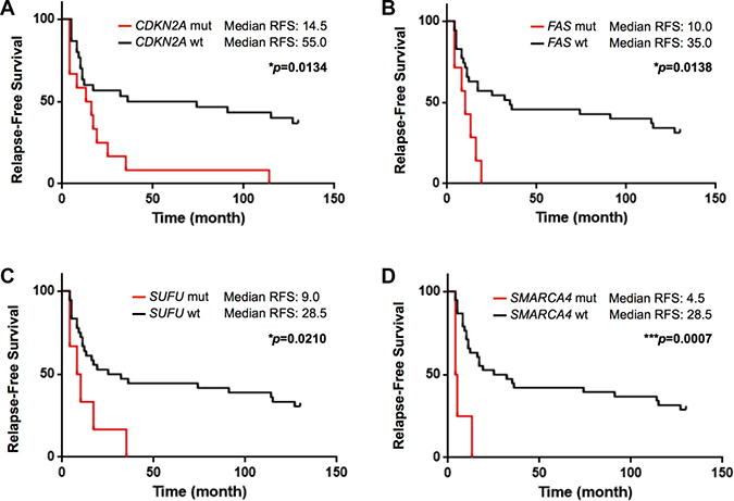 Figure 6: Kaplan–Meier curve of relapse-free survival according to mutational status in the TCGA cohort (TCGA, Provisional). The alterations of (A) CDKN2A, (B) FAS, (C) SUFU and (D) SMARCA4 showed shorter median relapse-free survival. Only FAS and SUFU genes were significantly associated with an increased risk of recurrence in early-stage NSCLC (Gehan-Breslow-Wilcoxon test). *p < 0.05.