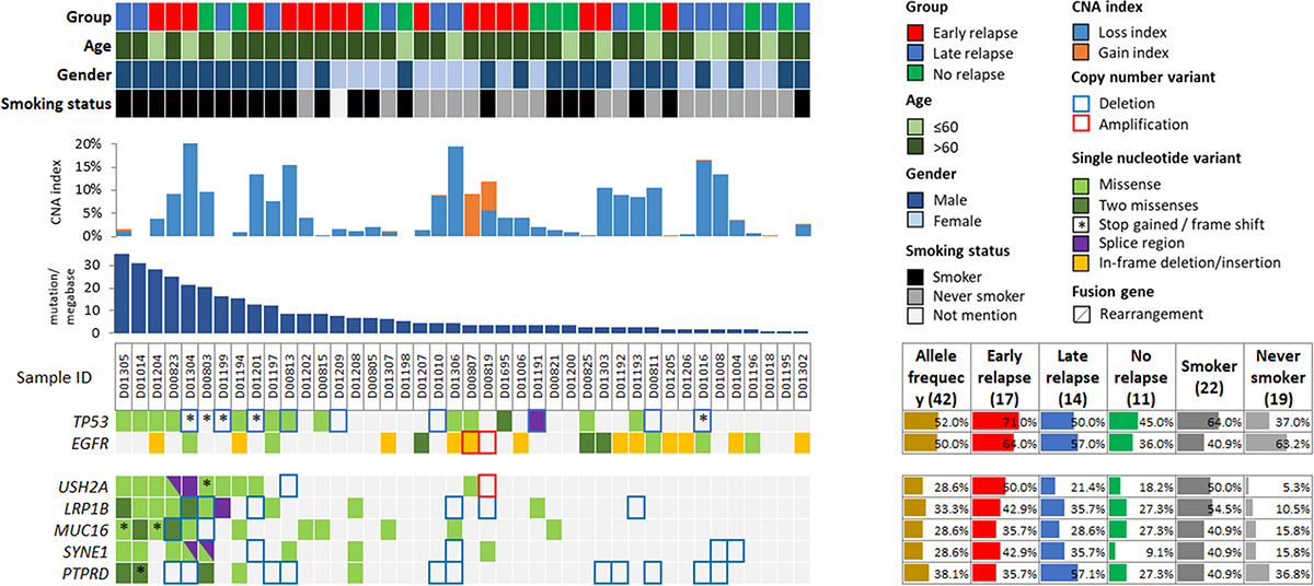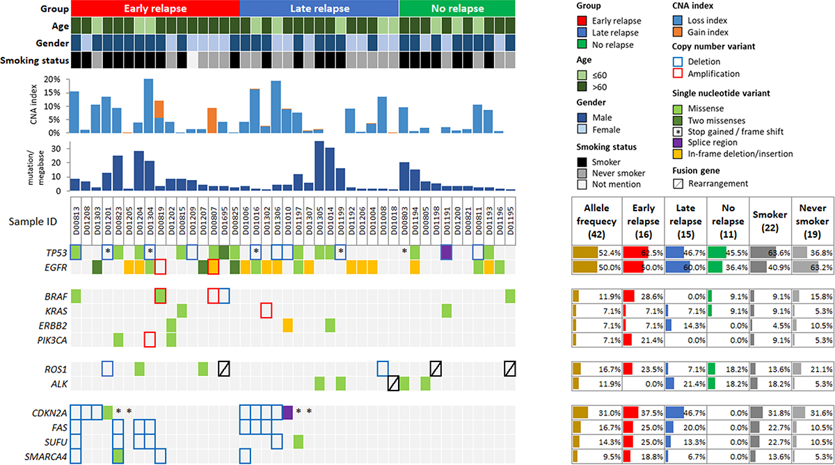 Figure 2: Genomic alterations identified in early-stage non-small cell lung cancer. Tumor samples of early relapse, late relapse, and no relapse are arranged from left to right. Patient information is displayed on the top panel, including group, age, gender, and smoking status. Tumor mutational number and copy number alteration (CNA) index are shown below the patient information. Genomic alterations are annotated according to the color panel on the top right corner of the image. Mutation rates of each gene are plotted on the right of the genomic alterations.