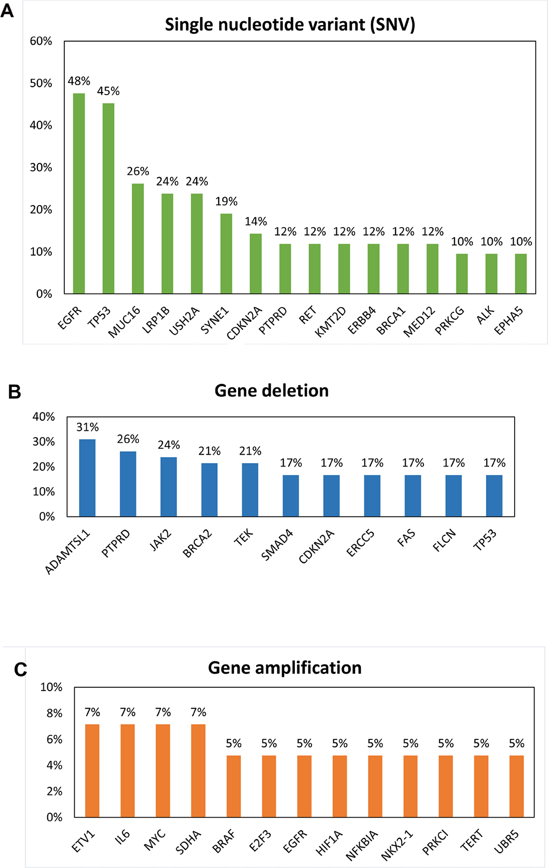 Figure 1: Frequency of genomic alterations in each gene. Top genes of (A) single nucleotide variant, copy number alteration of (B) deletion and (C) amplification are sorted by the total frequency of alteration events on the x-axis.