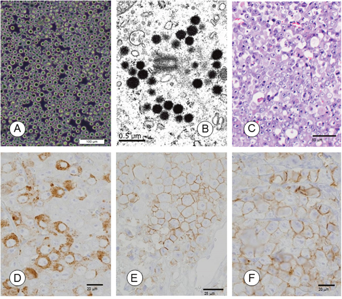 Figure 1: Morphological and immunohistochemical characterization of TCC-NECT-2 cell line. (A) Phase-contrast photomicrographs of TCC-NECT-2 cells. Scale bar: 100 μm. (B) Electron-microscopy revealed electron-dense core neurosecretory granules in TCC-NECT-2 cells. Scale bar: 0.5 μm. (C) Photomicrographs of subcutaneous tumors in recipient nu/nu mice following subcutaneous (s.c.) injection of TCC-NECT-2 cells. Scale bar: 50 μm, hematoxylin–eosin (HE) staining. (D) CGA, Scale bar: 20 μm, (E) CD56/NCAM, Scale bar: 25 μm, and (F) SYN/p38, Scale bar: 20 μm were immunohistochemically evaluated as indicated.