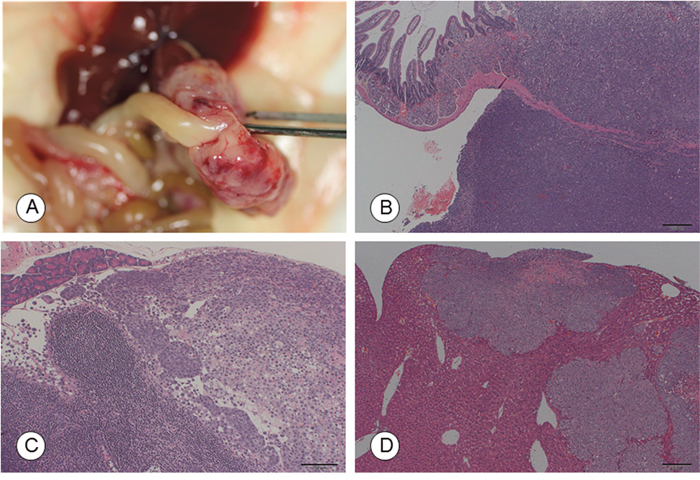 Figure 2: Macroscopic and microscopic photographs of tumors in the recipient mice following orthotopic implantation of TCC-NECT-2 cells. (A) Photographs and (B) micrographs of the intra-duodenal tumor at 50 days post-orthotopic implantation. Scale bar: 200 μm, HE staining. (C) Lymph node metastasis. Scale bar: 100 μm. HE staining. (D) Micrometastasis in the liver at 50 days post-orthotopic implantation. Scale bar: 200 μm, HE staining.