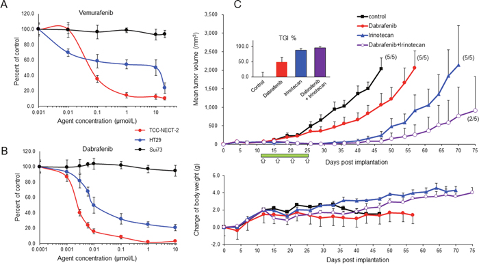 Figure 3: Effect of BRAF inhibitor on BRAFV600E-expressing TCC-NECT-2 cell proliferation and xenograft tumor growth. Inhibitory effect of vemurafenib (A) and dabrafenib (B) on proliferation of TCC-NECT-2, HT29, and Sui73 cell lines; 2 × 104 cells were seeded per well in 6-well plates, and exposed to vemurafenib or dabrafenib for 5 days. Each plotted value is the average ± SD. (C) Inhibition of TCC-NECT-2 xenograft tumor growth by dabrafenib or combination with irinotecan in nu/nu mice. Agents were administered orally for 14 days (green bar) starting on day 11 post-TCC-NECT-2 cell implantation as follows: dabrafenib at 30 mg/kg, once daily; irinotecan at 40 mg/kg, i.p. twice per week (white arrows). Tumor volumes and weights were recorded 2 to 3 times/week. Each plotted value is the average ± SEM for tumor volume and body weight. Numbers in parentheses: number of tumor-bearing mice/number of total mice; n = 5. The anti-tumor activity was assessed as the percent tumor growth inhibition (TGI%) in treated versus control mice (inserts). TGI represents the percent volume differential between treated and control tumors at the time when vehicle-treated tumors exceeded a volume of 2000 mm3 as described in the Materials and Methods section. TGI% is the average ± SEM.