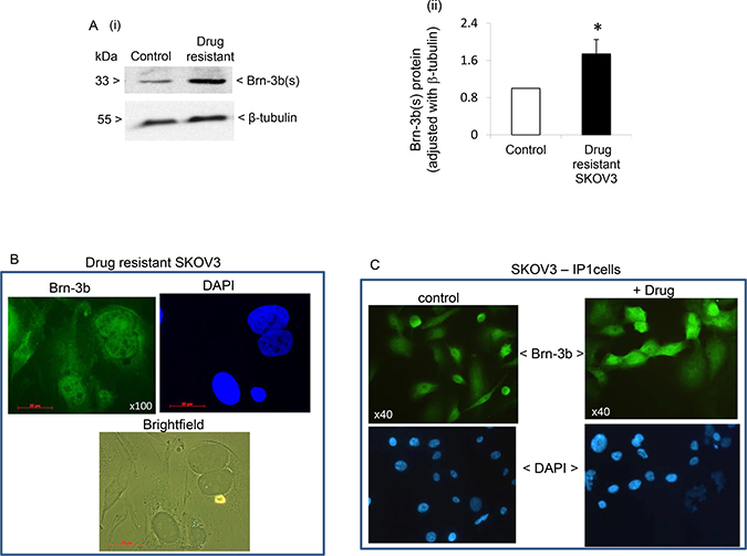 Figure 2: (A) (i) Representative western blot analysis showing increased Brn-3b protein expression in drug resistant cells compared with untreated control cells. (ii) Quantification of Brn-3b protein adjusted for β-tubulin in cisplatin resistant (drug-resistant) cells compared with control cells (set at 1). *Indicates statistical increase in Brn-3b protein (P < 0.05, student’s t test). (B) Representative immunofluorescence staining for Brn-3b proteins in drug resistant SKOV3 cells (2 weeks). Brn-3b protein was detected using FITC conjugated secondary Ab (green) and DAPI staining indicates the cell nuclei. Phase contrast microscopy shows the cell morphology in bright field. (C) Representative immunofluorescence staining for Brn-3b proteins in metastatic SKOV3-IP1 either in untreated controls or following drug treatment with cis + pax. Brn-3b protein was detected using FITC conjugated secondary Ab (green) and DAPI staining indicates the cell nuclei.