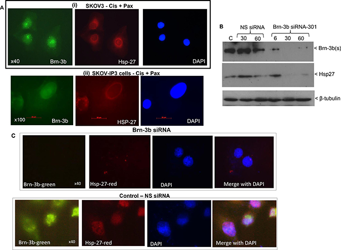 Figure 3: (A) Representative immunofluorescence staining for Brn-3b and HSP27 proteins in SKOV3 cells (i) or IP1 cells following drug treatment. Brn-3b protein was detected using FITC conjugated secondary Ab (green) and DAPI staining indicates the cell nuclei. (B) Representative western blot of SKOV3 cells transfected with Brn-3b siRNA-301 or non-silencing controls (NS siRNA) showing reduction of Brn3b protein levels and reduced HSP27 protein levels in cells transfected with Brn3b siRNA-301. β-tubulin blots were used to show variability in protein loading in different samples. (C) Representative immunofluorescence staining for Brn-3b and HSP27 proteins in SKOV3 cells transfected with Brn-3b siRNA-301 or non-silencing controls (NS siRNA) showing reduction of Brn3b protein levels and reduced HSP27 protein levels in cells transfected with Brn3b siRNA 301. Brn-3b protein was detected using FITC conjugated secondary Ab (green) whereas HSP27 Ab was detected using PE conjugated secondary Ab (red). DAPI staining indicates the cell nuclei. Images were captured at 40× magnification.